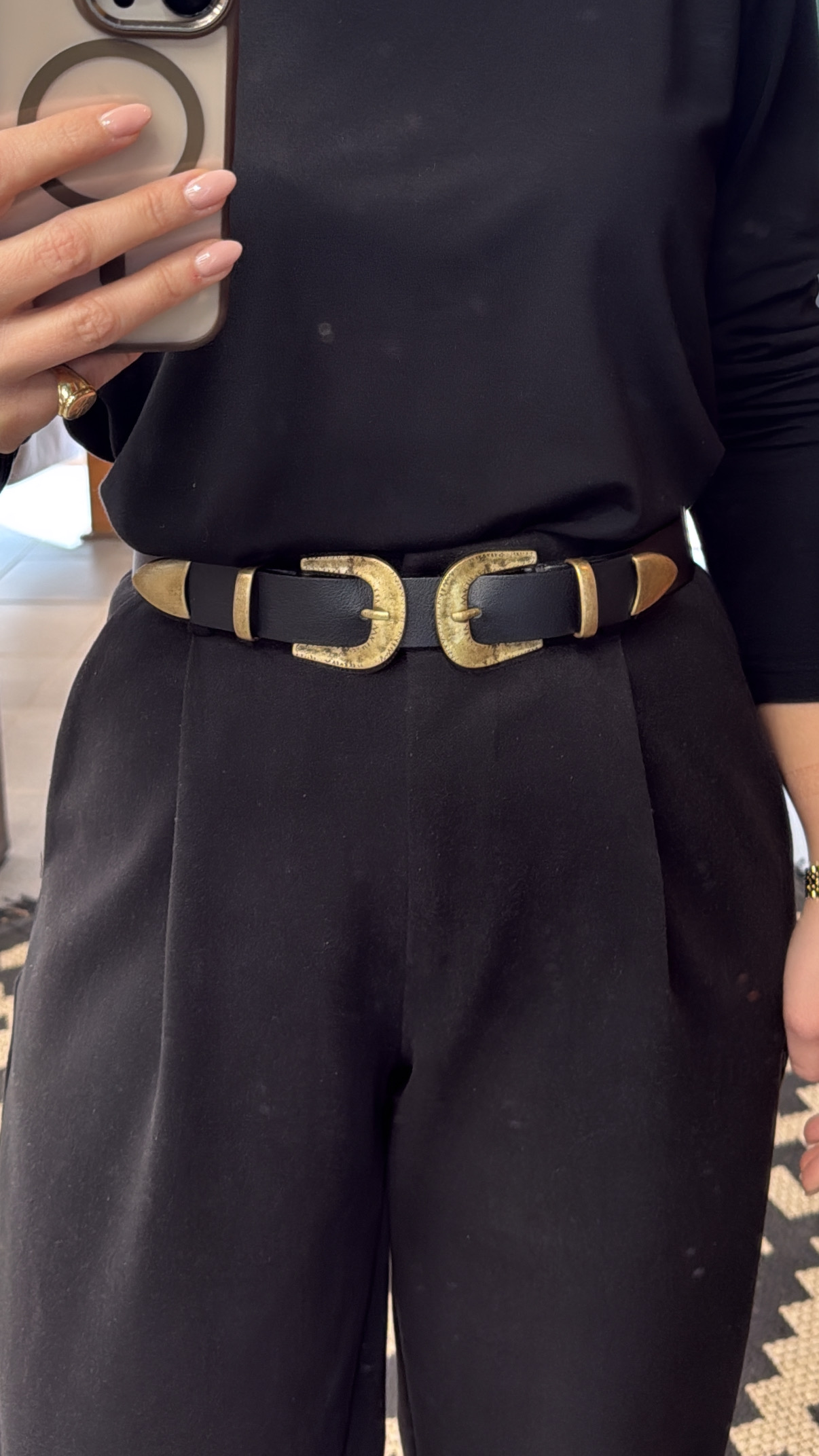 Χειροποίητη δερμάτινη ζώνη με μπρονζέ διπλές μεταλλικές αγκράφες.