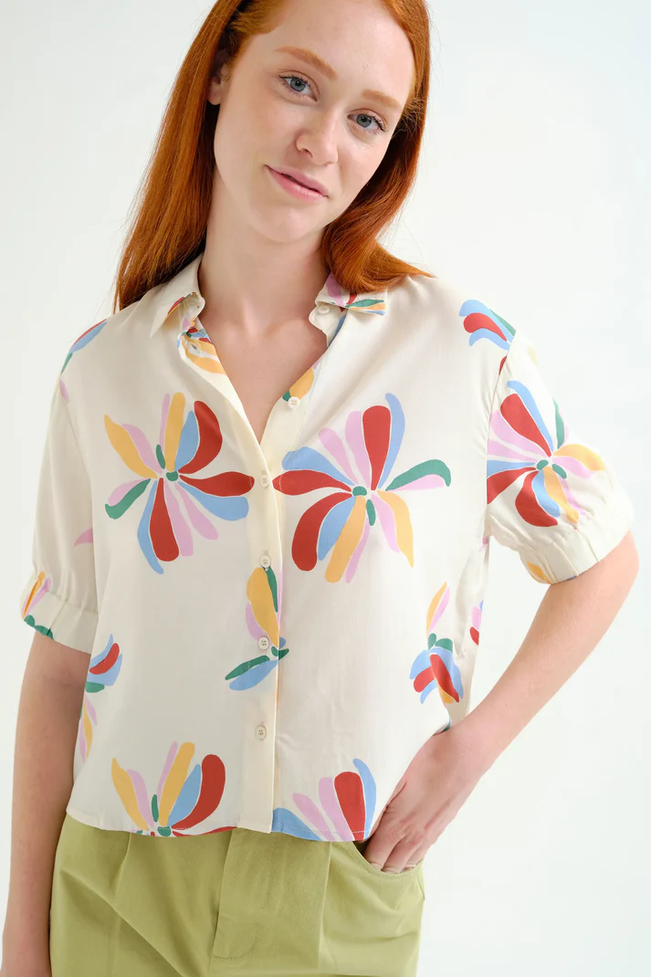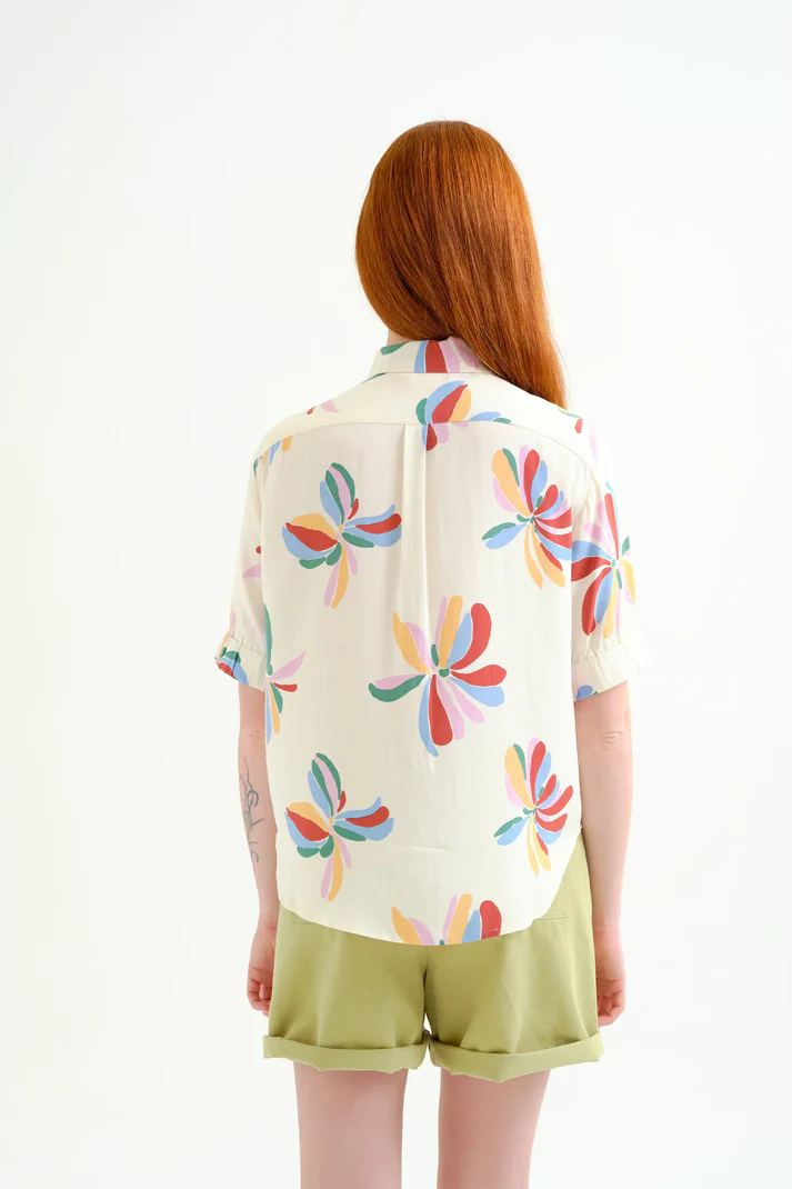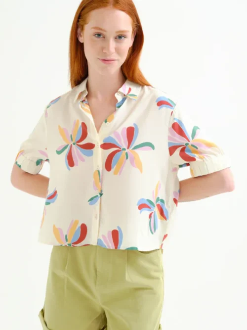 Πουκάμισο από ύφασμα Monarda με στάμπα. Γιακάς με πέτο και κοντά μανίκια με ελαστικό τελείωμα. Κλείσιμο μπροστά με λευκά κουμπιά. Το μοντέλο έχει ύψος 175 εκ. και φοράει μέγεθος S. 100% Visc