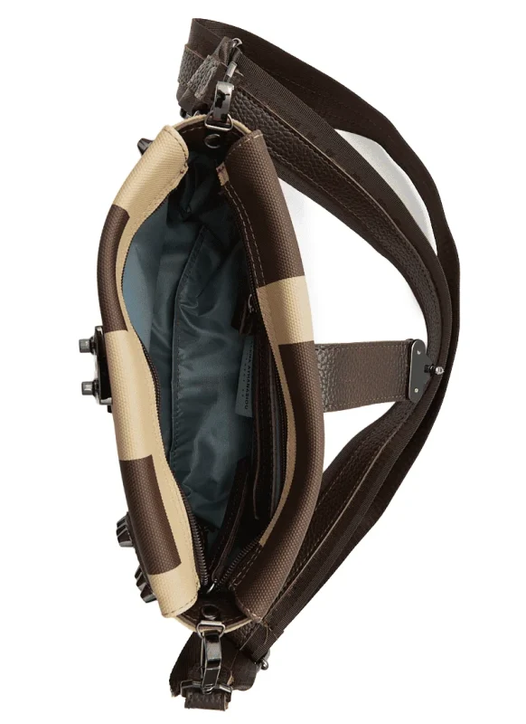 Signature και προσωπικά αγαπημένο item της σχεδιάστριας. Μία τσάντα που μετατρέπεται πολύ εύκολα από πρωινή σε βραδινή αφαιρώντας τον υφασμάτινο ιμάντα, ενώ τα πλαϊνά τρουκς της δίνουν πιο edgy style. Κατασκευασμένο από Vegan δέρμα, διαθέτει χώρο για τα απαραίτητα της μέρας ή της βραδιάς. Κλείνει με φερμουάρ, εσωτερικά επενδυμένη με αδιάβροχη φόδρα, με μία εσωτερική τσέπη με φερμουάρ και θήκακι για κέρματα ή κινητό. Με ευκολία θα το κατατάσσαμε στα top five προϊόντα της εταιρείας.