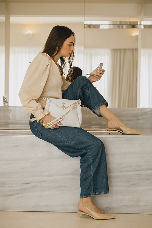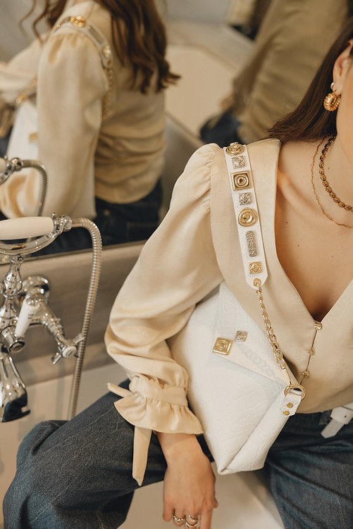 Χειροποίητη δερμάτινη τσάντα ώμου με μεταλλικές λεπτομέρειες σε χρυσό .
