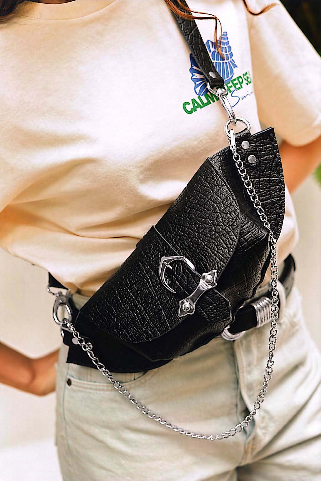 Χειροποίητη δερμάτινη τσάντα μέσης με νίκελ μεταλλικές λεπτομέρειες και μαγνητικό κούμπωμα.